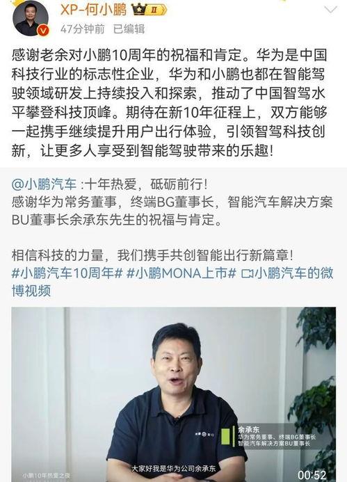 那天,小鹏汽车的官方账号突然发布了一条视频,内容竟然是公司创始人何小鹏与华为消费者业务CEO余承东的对话。这可真是让人意想不到,毕竟两位大佬的互动可是相当罕见呢!